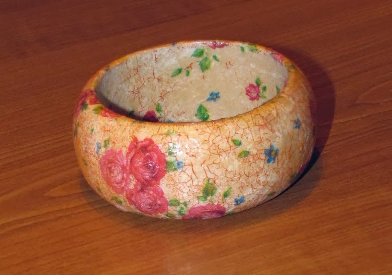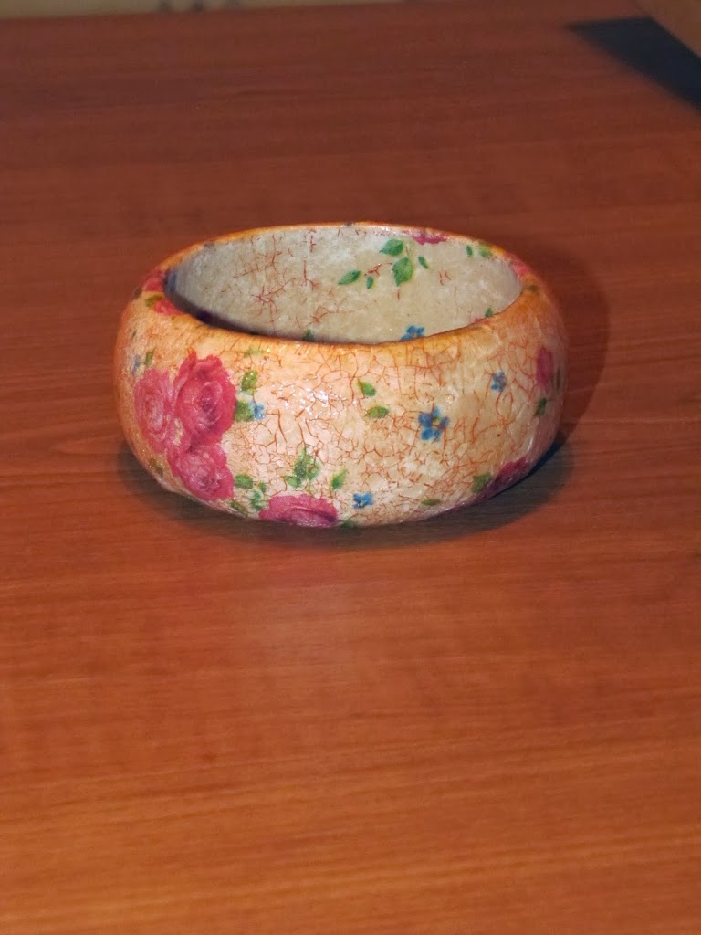 Az egyetlen dolog ami különbözik az maga a decoupage-ra váró tárgy. Ami ebben az esetben egy fa karkötő.