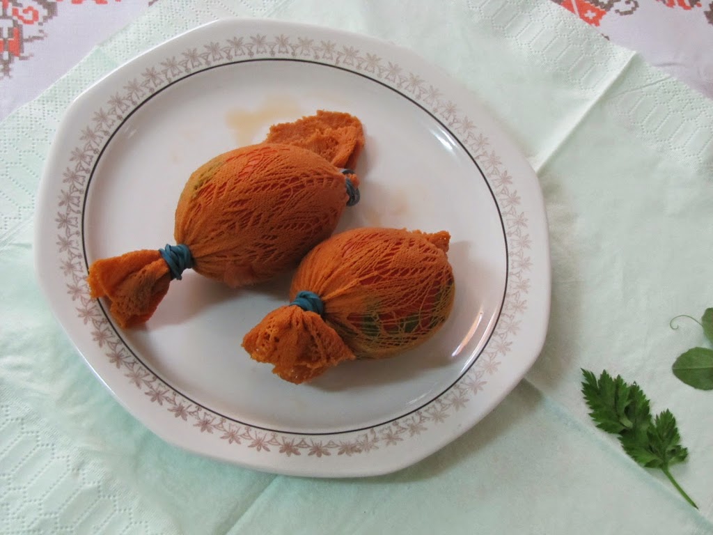 I mostly use natural things to colour the eggs. This year as well I used the onionskin technique and of course didn’t miss to make it special with some leafs in some unused sticking